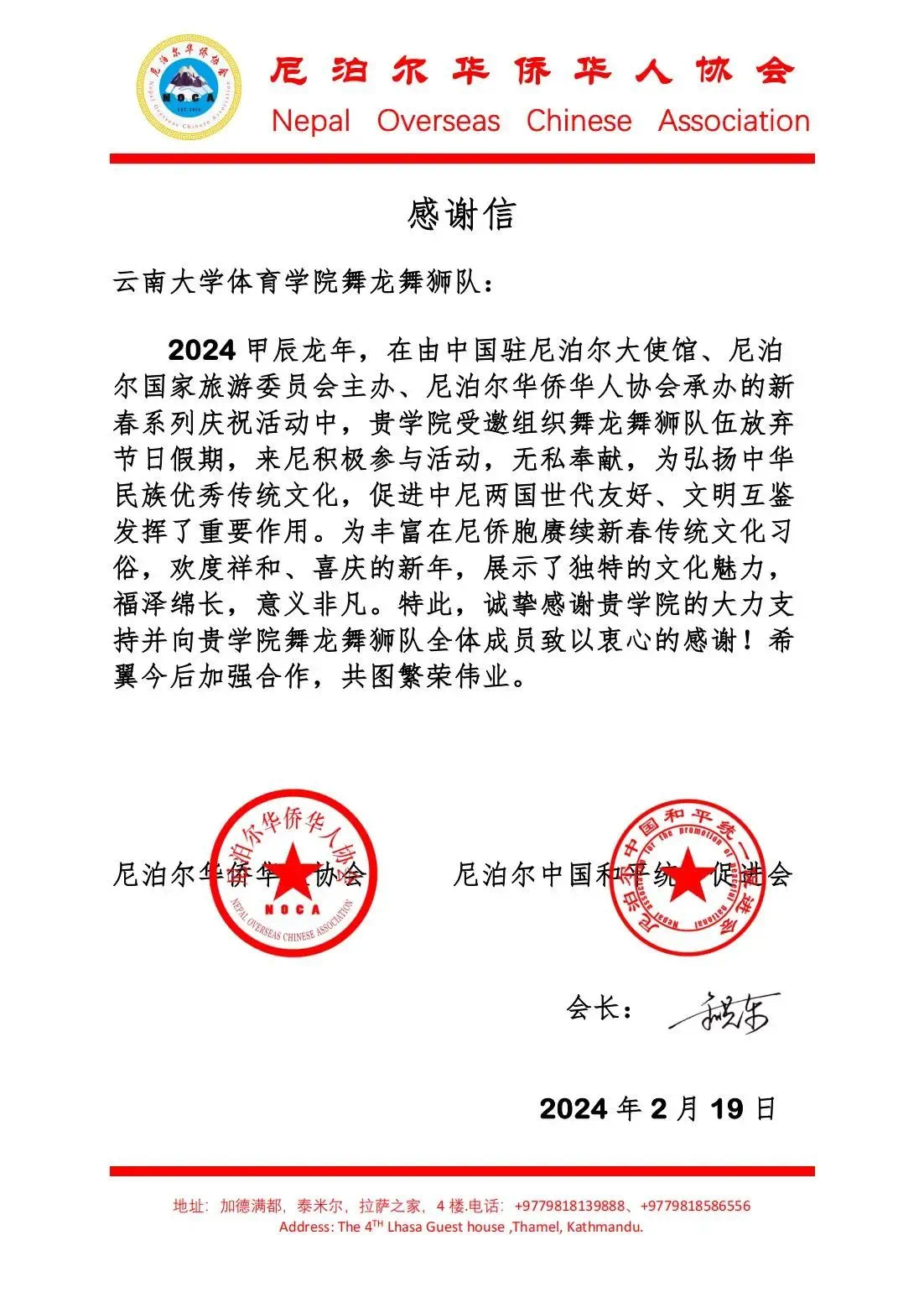 尼泊尔华人华侨协会致信感谢必一运动参加尼泊尔中国新年系列庆祝活动