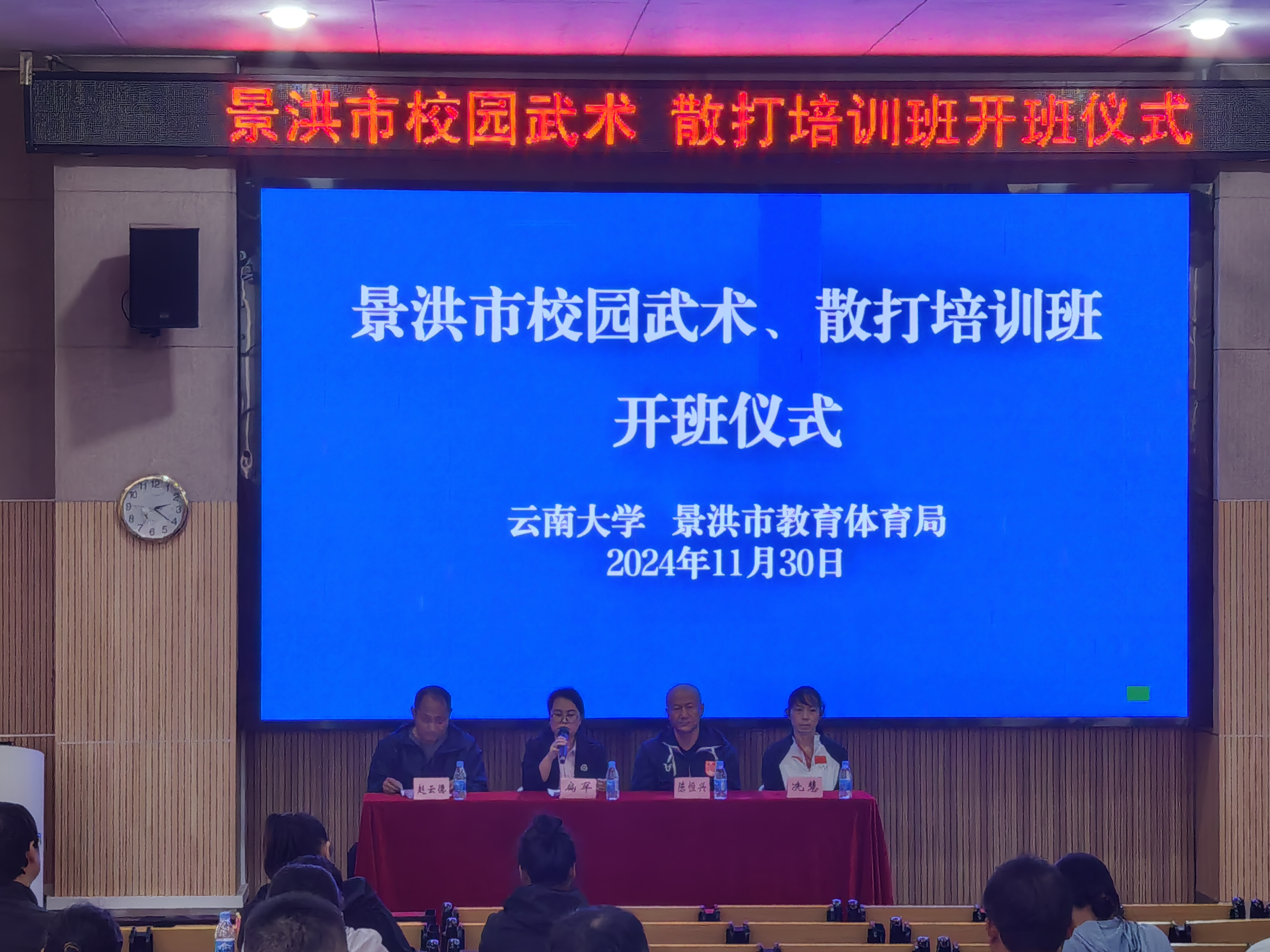 11月30日上午9点,开班仪式成功在景洪市第四中学报告厅举办。本次培训内容分为考试内容解读、评分标准介绍、规定套路学习三个板块,共有来自景洪市35所中小学、幼儿园的108名体育教师参与了此次培训活动。