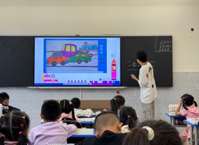 美术课堂上,李德麾老师以孩子们喜爱的动画视频进行导入,利用简单直观的教学手段,让孩子们轻松掌握排列法和遮挡法,更好地去描绘他们心中“繁忙的大街”。在员工创作时,李老师亲切地进行巡回指导,鼓励他们充分发挥自己的想象力和创造力,用色彩和线条绘出独特的城市街道印象。
