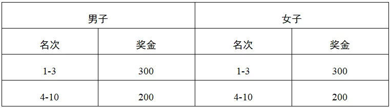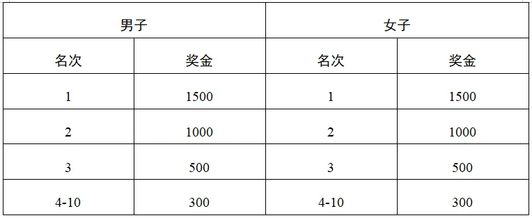 录取半程马拉松男、女第一至第十名参赛选手分别获得如下表所列奖金(单位:人民币);男、女第一至第三名颁发奖牌。