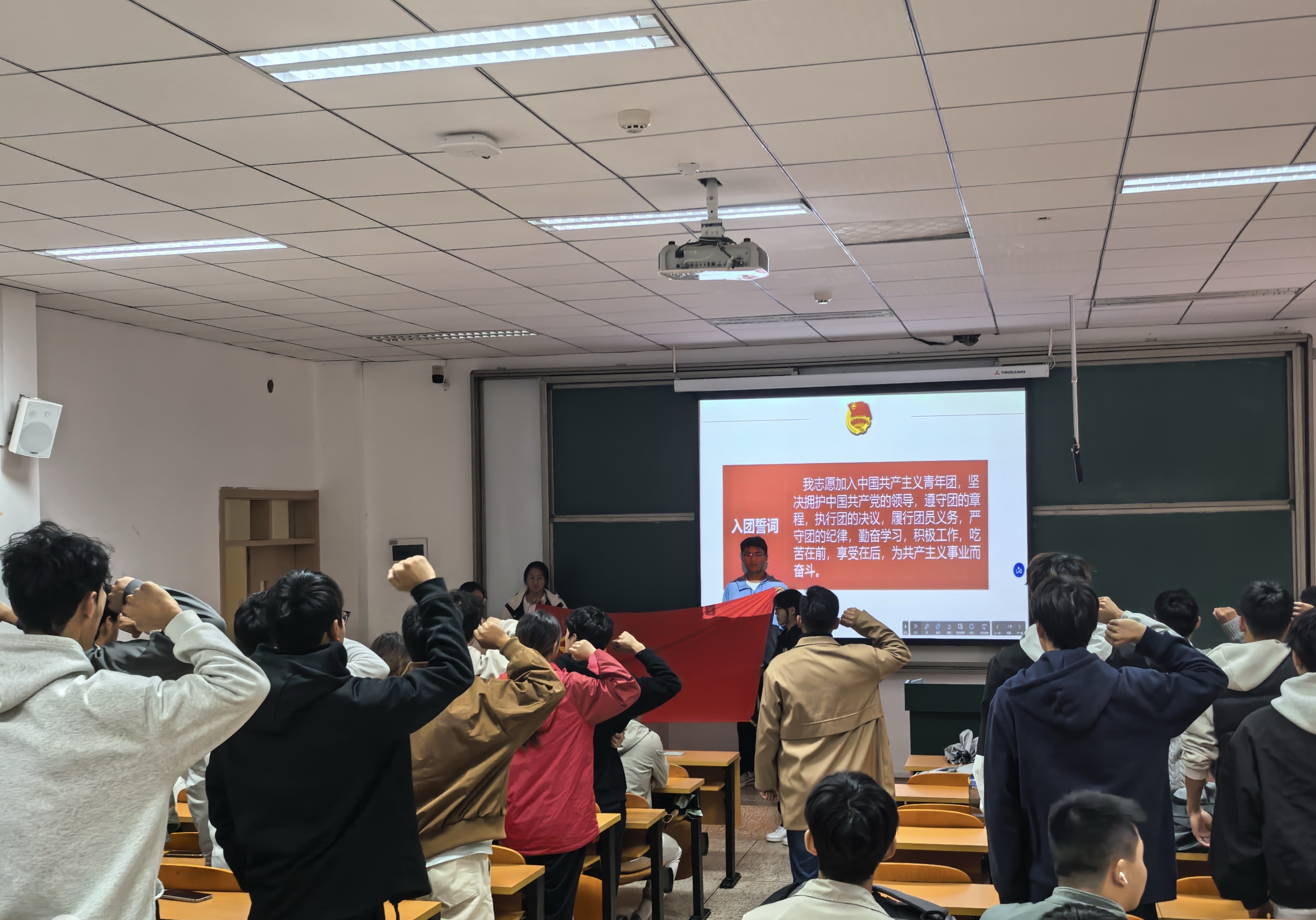 全体人员肃立高唱国歌,入团仪式正式开始。袁老师宣读新发展团员名单,共有35名同学光荣加入中国共产主义青年团,在其带领下,全体新团员右手握拳、举过头顶,面向团旗庄严宣誓。袁老师代表学院团委,对新团员提出三点希望:坚定理想信念、勤奋学习实践、锤炼高尚品格。最后,全体人员齐唱团歌,入团仪式圆满结束。